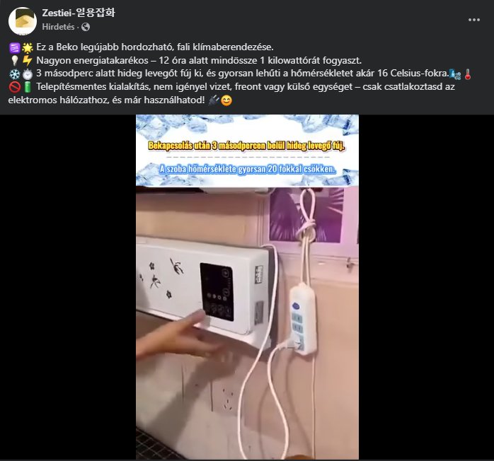 A képen látható készülék tulajdonsága általában az, hogy kishelyiséget (például fürdőszobát) gyorsan felfűt, amihez nem kell felfűteni az egész házat a kazánnal. Nincs kültéri egysége, tehát hűteni nem lehet vele. Hiába állítható akár 18 fokra, az csak azért van, ha attól hidegebb helyiséget kell fűteni vele. A videóban látott is pont ugyanilyen. Az, hogy hűteni is tud, az nem igaz. Ugyanis nincs hozzá kültéri egység, ami a hideget állítaná elő. Ez nem más, mint megtévesztés, csalás.