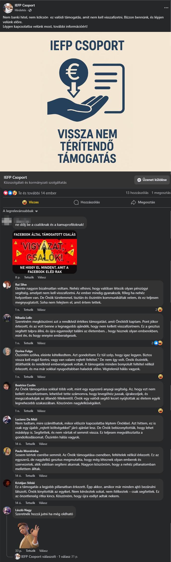 Ebben a sorban a leggyengébb láncszem a hiszékeny ember. Amíg van ember, aki a facebookon hirdető csalónak bedől, elhiszi hogy pénzt kérhet egy kamu pénzintézménytől, addig csak a csalókat támogatod. A facebookon gombamód szaporodnak a frissen készült kamu pénzintézetek oldalai. Pedig csak icipicit kellene jobban körülnézni.